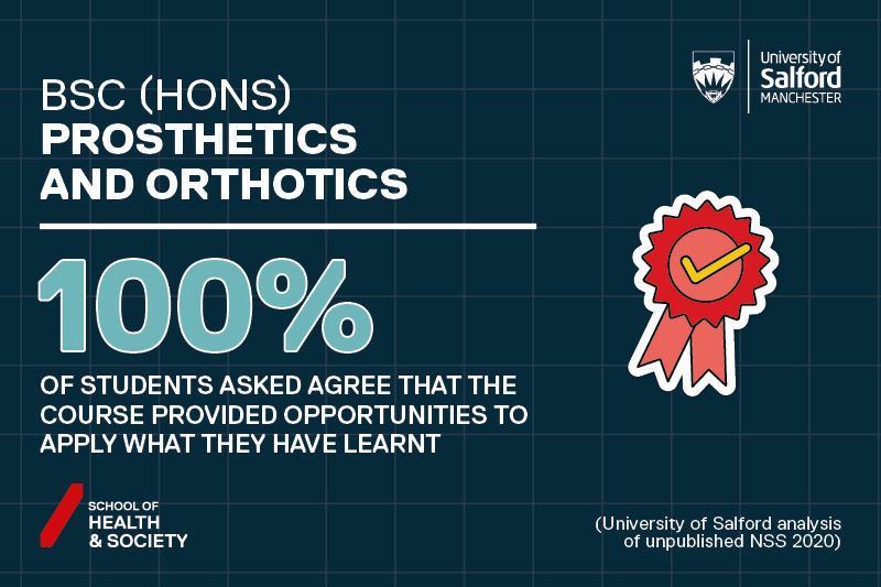 This course includes a wide variety of clinical, practical and theoretical learning. You will spend most of your time at the University but you will also spend time in clinical placements where you will get the chance to see real patients wearing their prostheses and orthoses. You will also get the chance to see patients at the University, within our purpose-built facilities, and work with the latest technologies and equipment that are used for today's prosthetic and orthotic devices.
