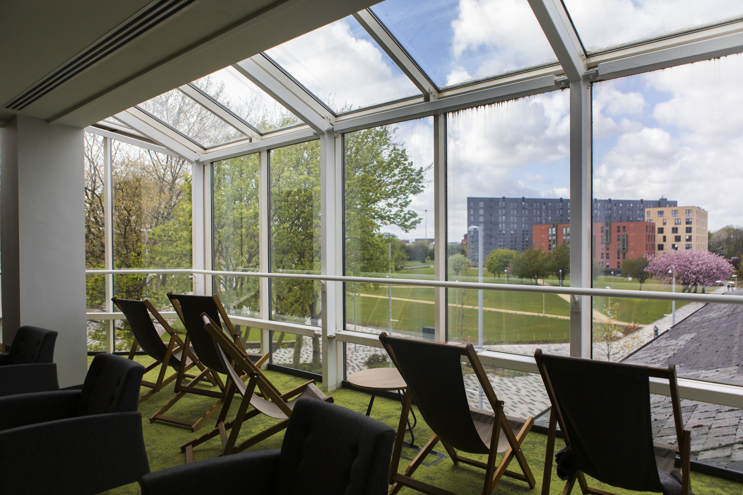 In 2016 and 2017, our Clifford Whitworth Library underwent a major refurbishment. The theme of the refurbishment was the “library in the park”, celebrating the fact that the University of Salford benefits from an attractive green campus, overlooking the historic Peel Park (the first municipal park in the UK).