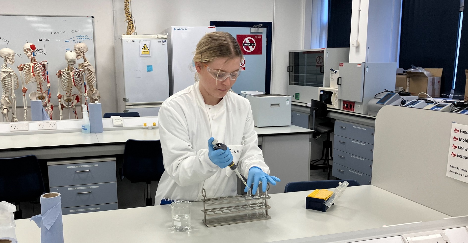 Ella spends four days working as an Associate Practitioner in the Histopathology cancer labs at Wythenshawe Hospital, Manchester and one day a week studying in the state-of-the-art facilities at the University of Salford.