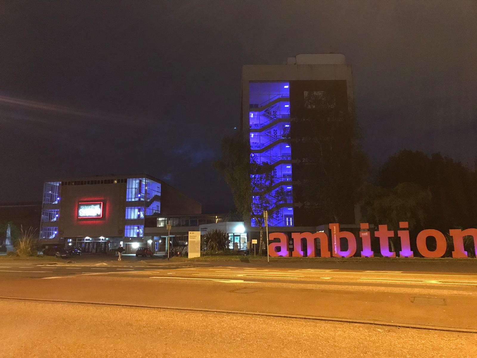 Maxwell and Maxwell Hall are the second lot of buildings to light up on campus after Salford’s iconic Peel Building shone blue last week.