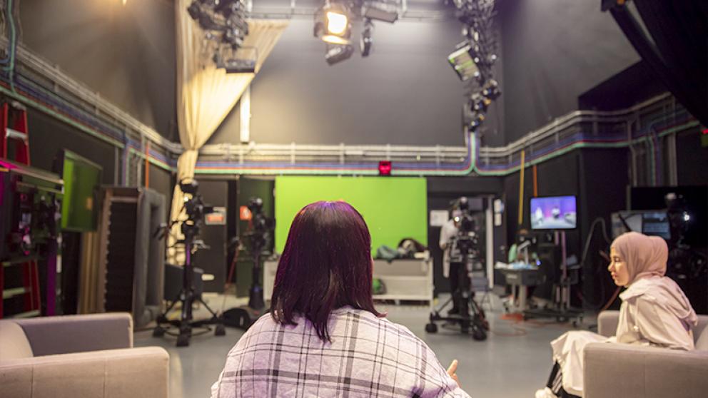 Journalism students presenting in news studio