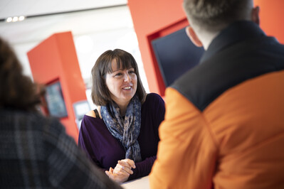 Staff member talking to two students